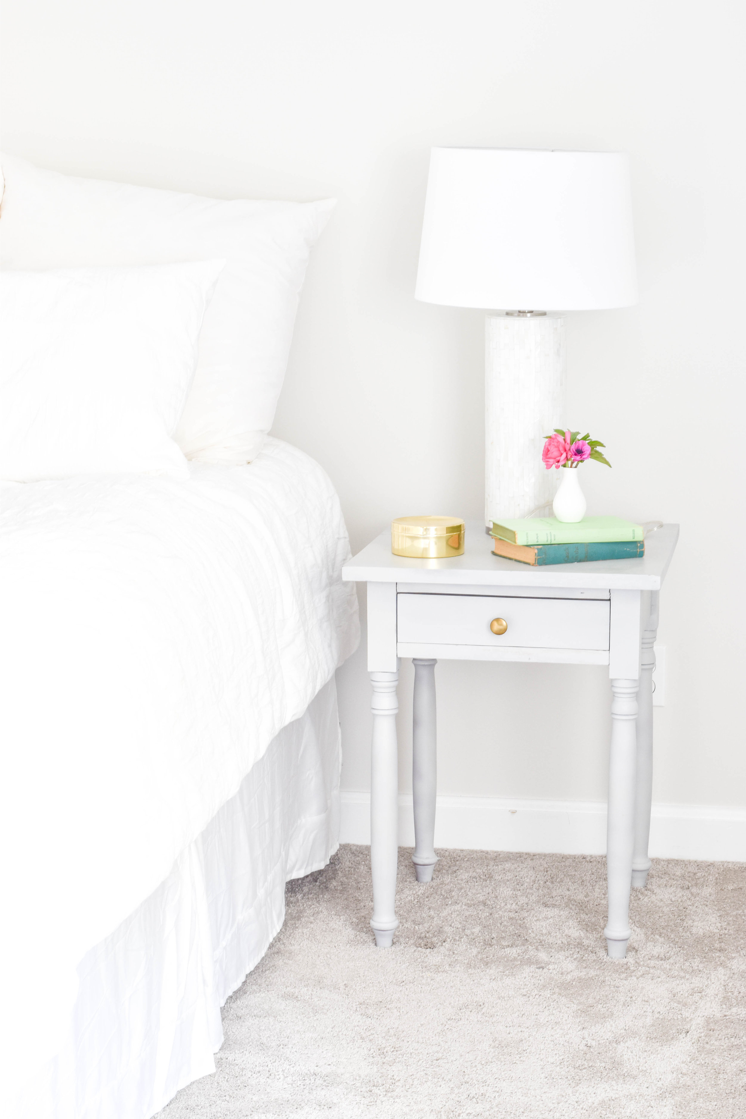 I fell deep into the world of Craigslist the other day. I was looking for tables I could paint and use in my classroom for flexible seating options, because what else do teachers do but spend their own money to try and have nice things… I was reminded how much I loved rehabbing furniture and I was trying to think of the last item I rehabbed, which were these nightstands that I never shared! We owned these wood nightstands for over 4 years before I revamped them. They were a second hand furniture find when we first got married and bought our house. We were in a “crap we spent all our money on a house, now we need furniture” phase and needed nightstands for our room. These nightstands combined with the yellow walls and green carpet in our room were quite an ugly sight, but we all start somewhere, ugly as it may be.